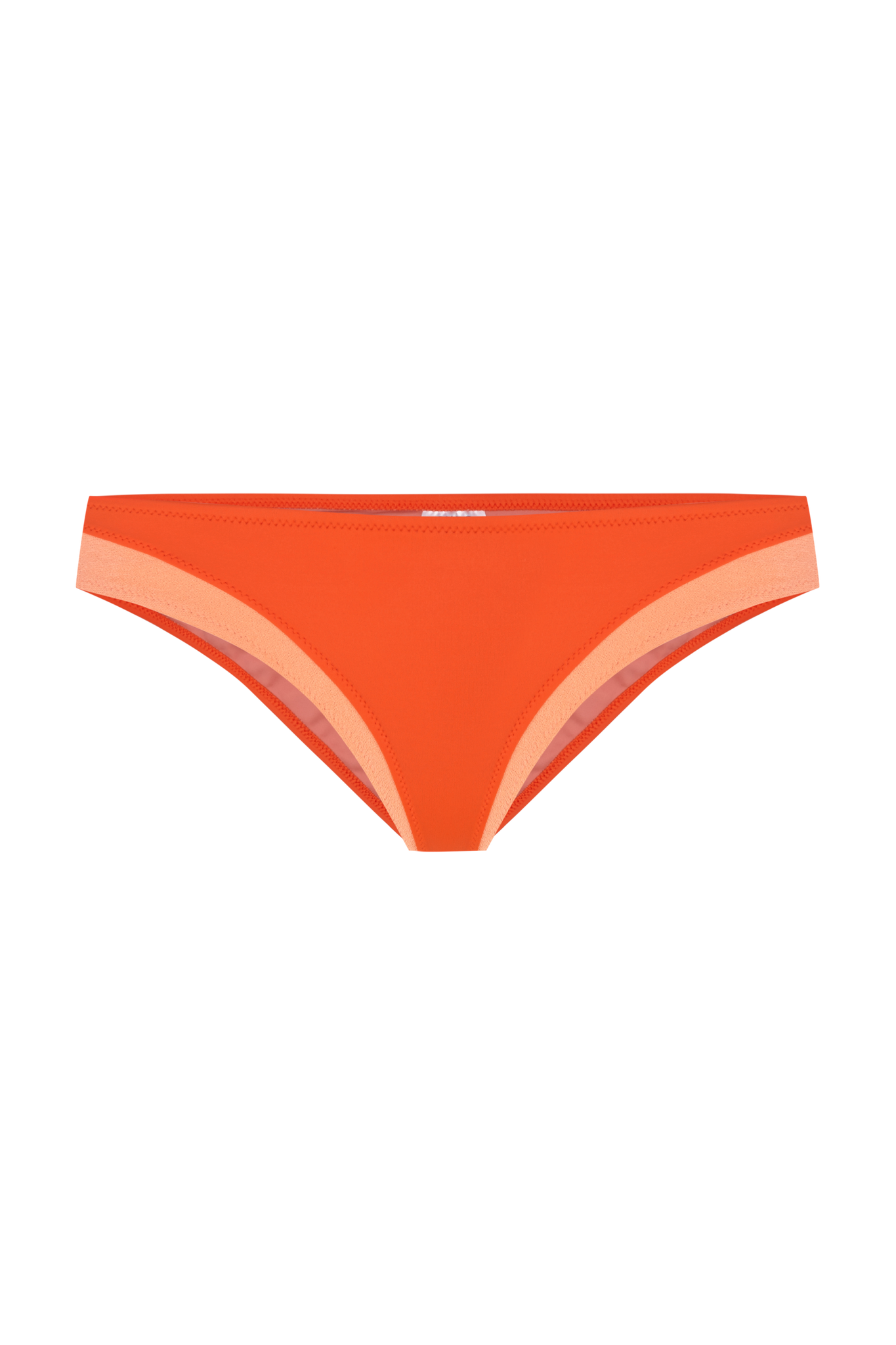Low rise bikini bottom with contrast panels that creates the illusion of layering.